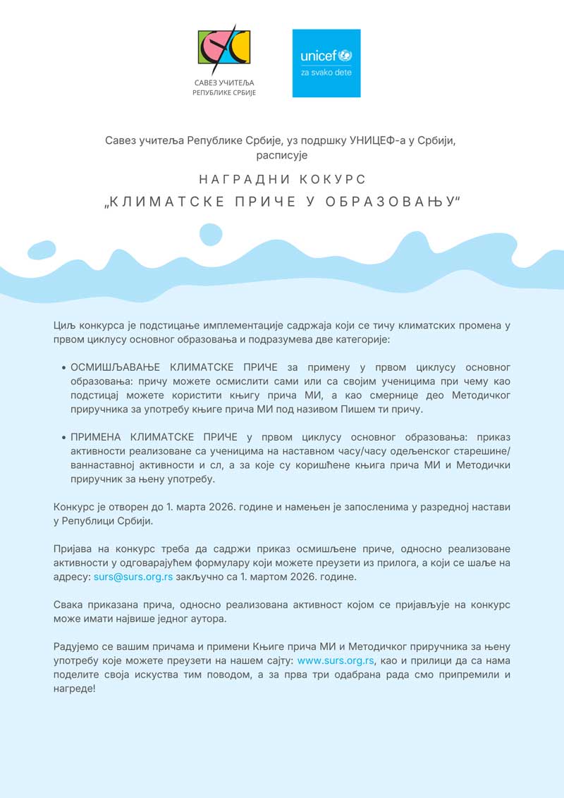 НАГРАДНИ КОНКУРС „КЛИМАТСКЕ ПРИЧЕ У ОБРАЗОВАЊУ“Вести / 30. децембар 2025. Овде можете преузети: Пријавни формулар за осмишљену причу Пријавни формулар за реализовану активност